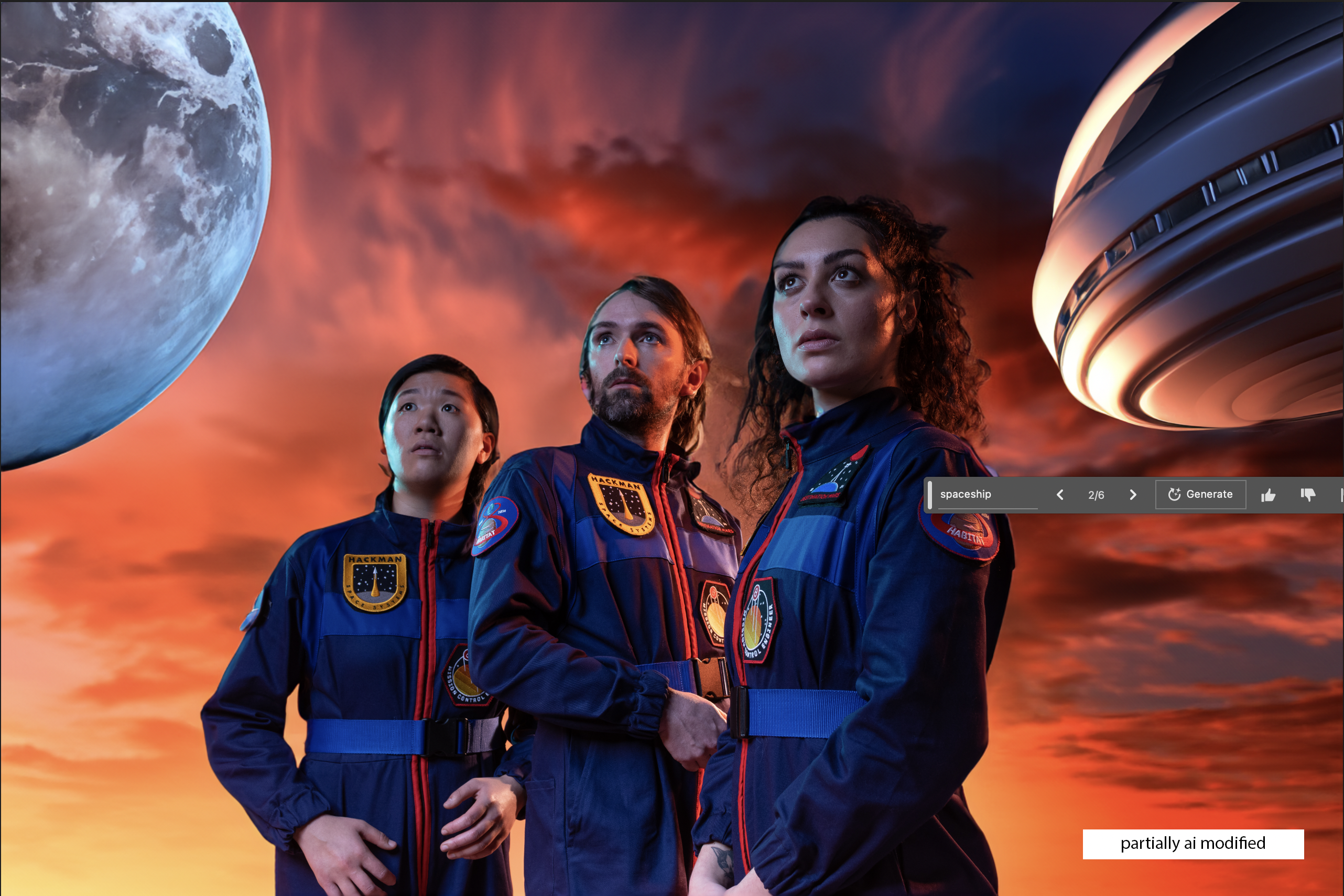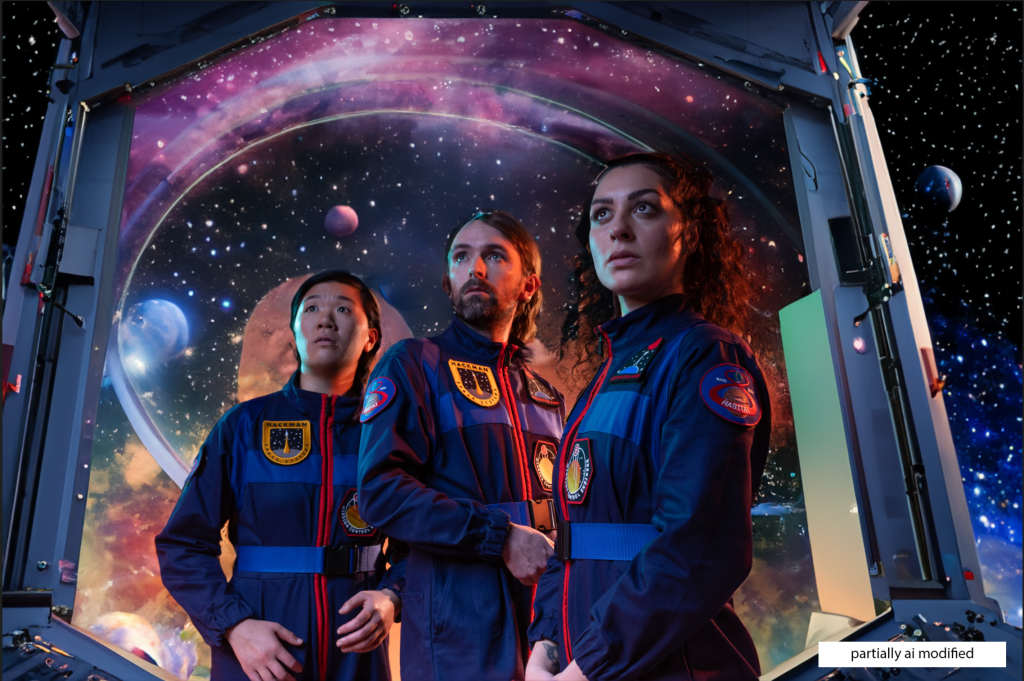 Serious ethical questions aside, it is actually really fun playing around and experimenting with generative fill on the right project. Here are a couple of results below for a studio shoot I did for Destination Mars after typing in various prompts like ‘martian landscape’ and ‘space station interior’ .